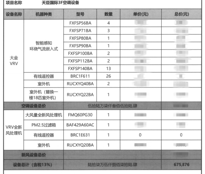 項目內容:大金空調 SkyAir Multi系列 VRV-D VRV-X7系列中央空調 VRV X新風處理機全新風集控系統安裝項目
