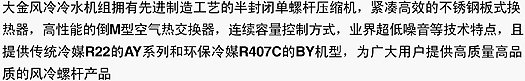 • R407C冷媒 • D-Tandemstage回路 • 全系列機型COP達到3.2~3.7 • 壓縮機及風扇實施新型降噪措施 • 寬廣的機組運轉范圍 • 可進行10%~100%的連續容量控制