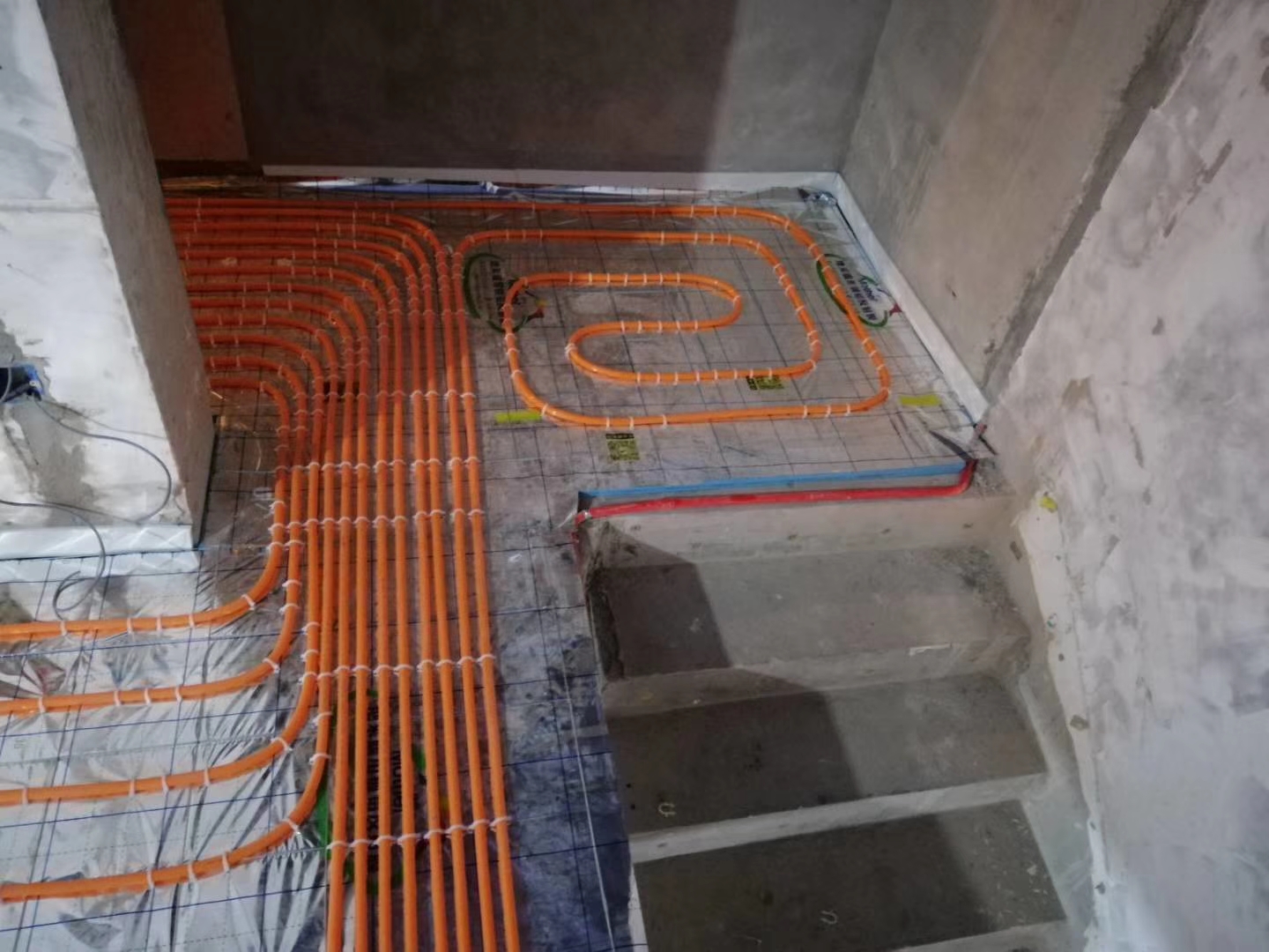 第一步是鋪設保溫板和反射膜。在我們把地面清理干凈以后,首先在原有地面上鋪我們選擇的擠塑板,擠塑板一定要鋪得平整嚴密,然后用膠帶進行固定。在擠塑板的上面開始鋪反射膜,反射膜要鋪嚴,反正膜交接的地方同樣也要使用膠帶進行固定。第二步是鋪底層鋼筋網片。鋼筋網片的規格一般是10mm×10mm,鋼筋網片所使用鋼筋的直徑一般是3mm。鋪設鋼筋網片的目的也就是為了固定我們的地盤管,防止位移以及澆筑混凝土時出現的管道的上浮等情況。第三步是鋪地采暖的地盤管道。地采暖的地盤管道就是地采暖的地盤管的安裝,具體安裝的時候是從分集水器開始,按照我們的設計要求鋪設每個房間的地采暖管道。這里要求的是管道之間的間距要符合要求,另外每個回路的長度要大概一致。此外單個的長度盡量要控制在100米以內。最后使用扎帶把地才能管道與鋼筋網片進行固定。第四步是鋪設上層鋼筋網片。在地采暖管道鋪設完成以后,我們需要在地采暖管道的上層再鋪設一層鋼筋網片。鋪設這層鋼筋網片的作用是防止我們的后澆層出現開裂。在鋪設完上層鋼筋網片以后,一定要把上下層鋼筋片使用扎帶進行固定牢固。第五步是澆筑回填層的混凝土。回填撐死凝土的厚度一般來說都是60mm左右,混凝土的強度一般都是C20的豆石混凝土。在澆筑的時候一定要注意防止地采暖管道出現位移和上浮的情況。澆筑完成以后要及時養護,以防止造成地面的開裂。