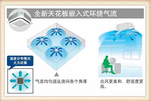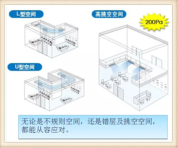從機型來看,天花板嵌入式(環(huán)繞氣流)室內(nèi)機,對應(yīng)大開間和方形空間,氣流均勻,造型更美觀。溫度分布情況大為改善;天花板嵌入導(dǎo)管內(nèi)藏式室內(nèi)機,對應(yīng)狹長型、U型和L型等不規(guī)則空間,有多種送回風(fēng)形式,輕松實現(xiàn)與內(nèi)裝的融合;自由靜壓風(fēng)管室內(nèi)機,對應(yīng)不規(guī)則空間和挑高空空間,即使內(nèi)裝格局經(jīng)常改變,也能輕松對應(yīng)。