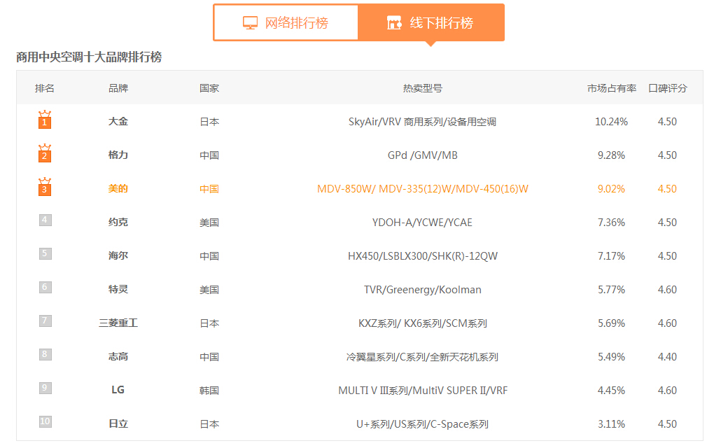 目前,辦公樓、商場(chǎng)、酒店等大型場(chǎng)所都使用中央空調(diào),因?yàn)槠胀ǹ照{(diào)的功能滿足不了這些場(chǎng)所的需求。商用中央空調(diào)有哪些牌子?三菱電機(jī)、美的、大金、格力、海爾、日立、特靈、開(kāi)利、約克、麥克維爾、東芝、遠(yuǎn)大等眾多世界知名中央空調(diào)品牌排名如下: