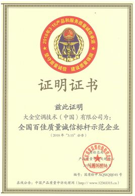 近日,國家質(zhì)量監(jiān)督檢驗檢疫總局產(chǎn)品質(zhì)量申訴處理中心向大金空調(diào)頒發(fā)了“全國百佳質(zhì)量誠信標桿示范企業(yè)”證書,旨為彰顯質(zhì)量誠信標桿企業(yè)的引領(lǐng)作用,增強全社會的質(zhì)量誠信意識,引導(dǎo)全社會積極響應(yīng)“中國制造2025”戰(zhàn)略。在全國各行業(yè)內(nèi)審核確認“全國百佳質(zhì)量誠信標桿示范企業(yè)”,大金空調(diào)為今年全國范圍內(nèi)的百家獲獎企業(yè)之一。